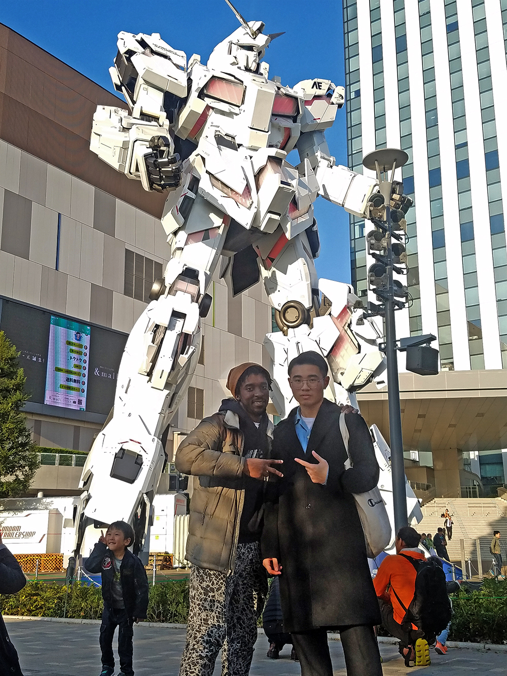 Posing in front of the Gundam statue during a KCP class trip.