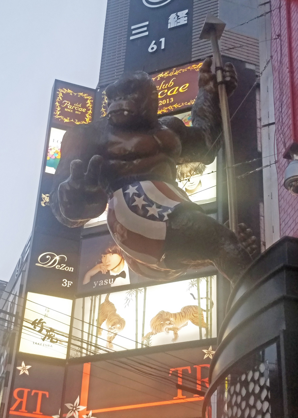 A giant gorilla display gives the peace sign at Kabuki-cho.