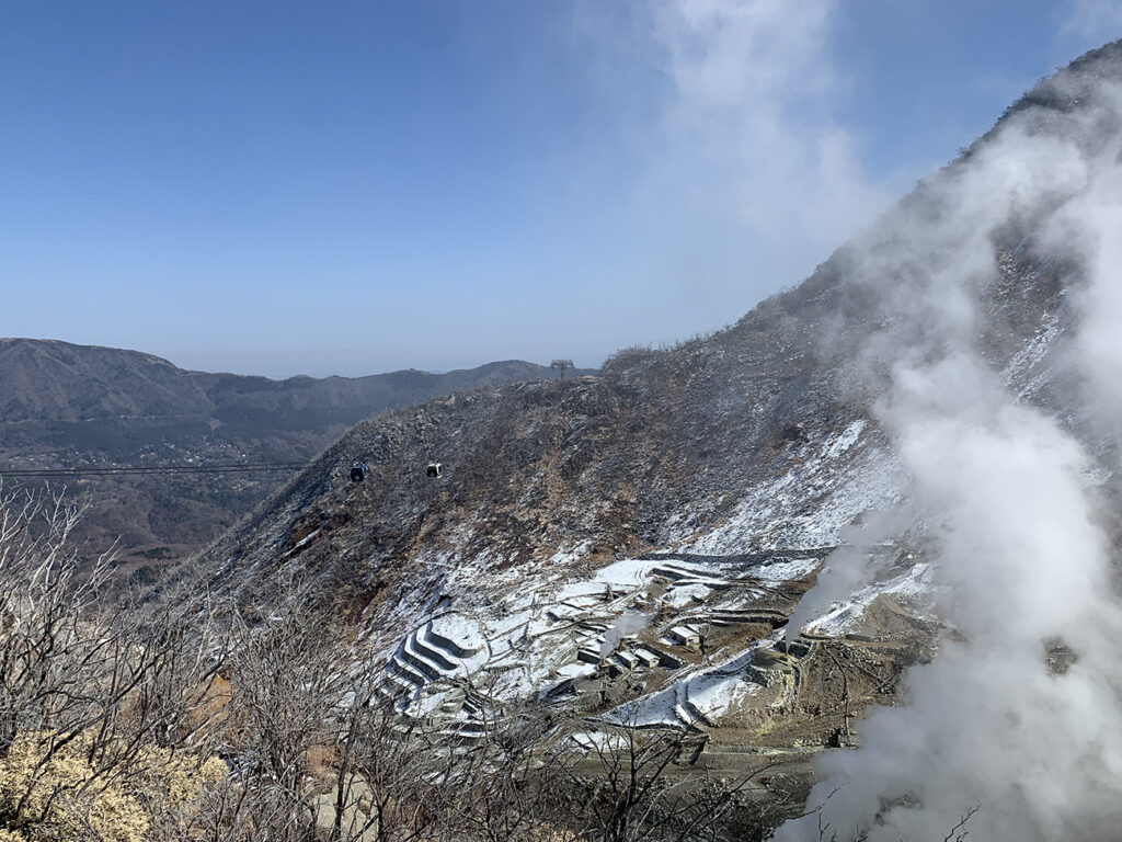 If you turn around and face your back to Mount Fuji, you’re met with incredible views of the valley and the sulfur vents below.