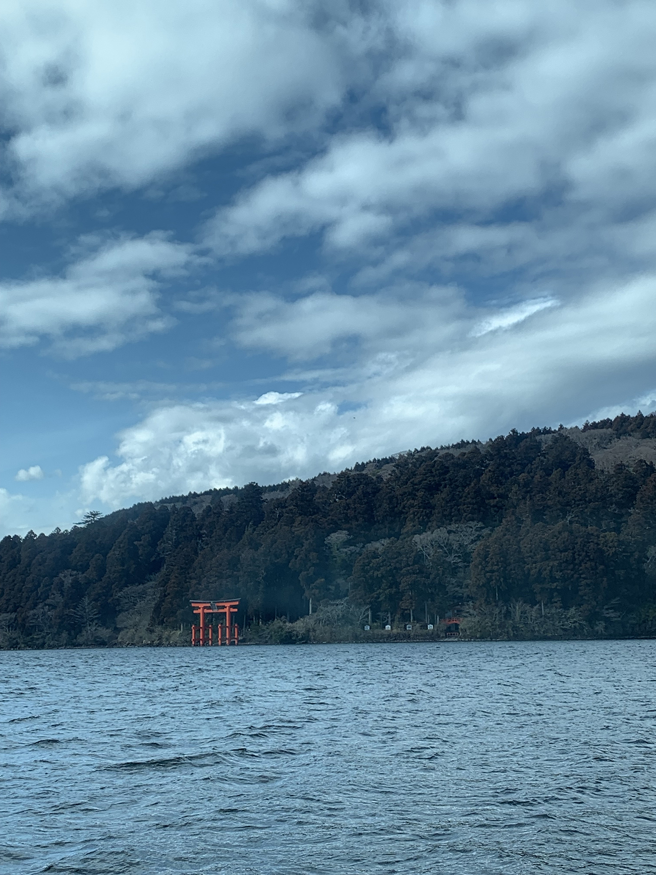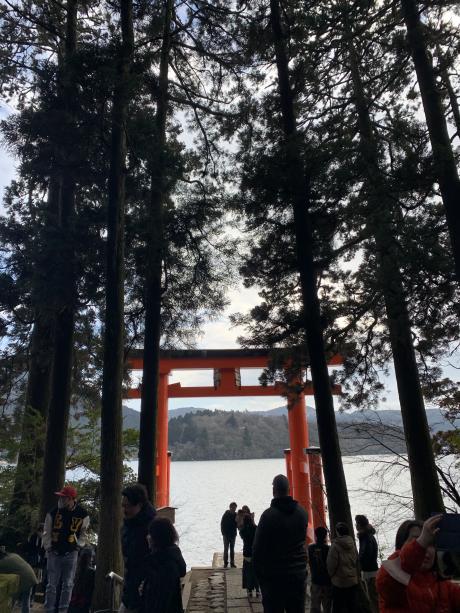 The view of the floating torii gate of Hakone Shrine from the sightseeing cruise. It’s known as the “Gate of Peace” (Heiwa no Torii).